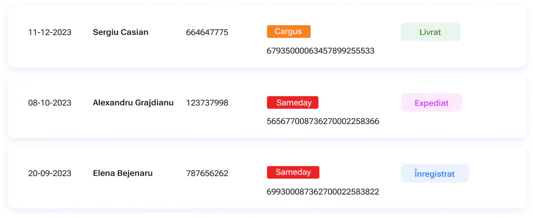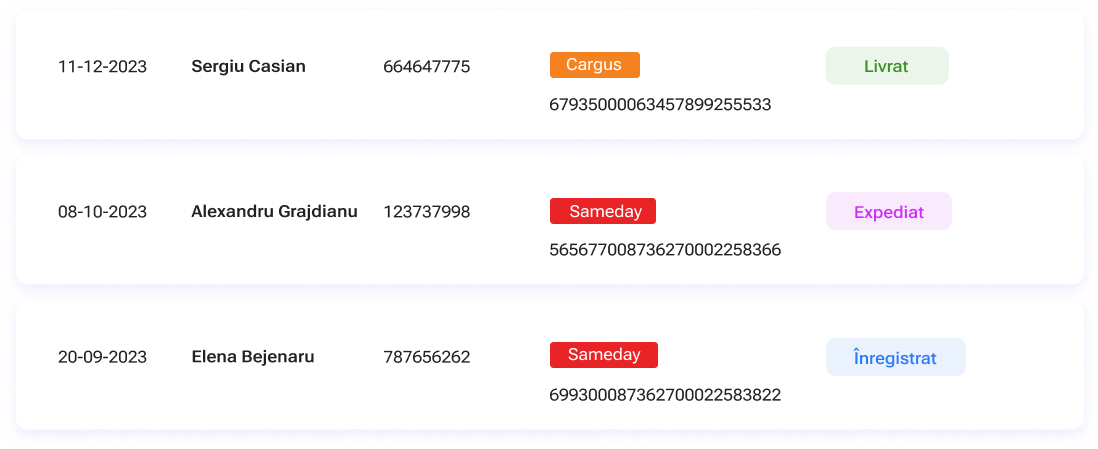 Coletele returnate sunt livrate la adresa indicată de dumneavoastră. Prin centralizarea procesului de retur într-un singur serviciu, beneficiați de livrări regulate și previzibile, eliminând problemele legate de colete cu adrese greșite sau expediate cu plata ramburs. De asemenea, puteți gestiona în timp real întregul proces de retur direct din platforma noastră online.