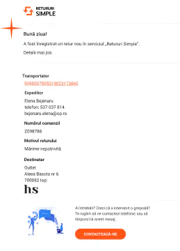 Fiți mereu la curent cu statusul fiecărui retur. Platforma noastră vă oferă vizibilitate completă și flexibilitate în modul în care primiți informațiile esențiale. Oferim 2 opțiuni, iar dvs. decideți cum doriți să primiți notificarea. Puteți utiliza ambele opțiuni în același timp sau o puteți alege pe cea care este mai convenabilă pentru dvs.